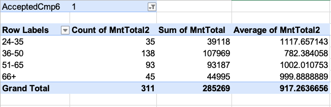 Used general aggregations to find total amount spent, minimum, maximums and IF statements to organizing the customers by age group. Created pivot tables to show the number that bought during campaign 6 broken down by age.