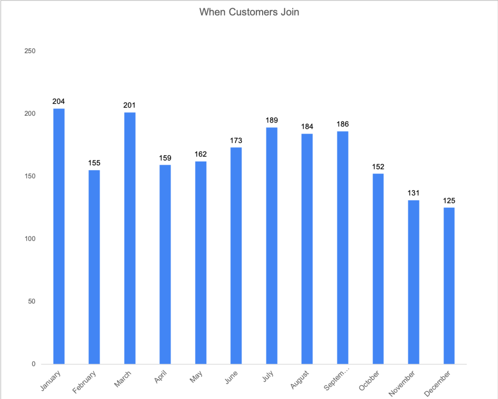 - Customer Join Times: This chart revealed a drop in new members in Q4, suggesting an opportunity to rally up promotions efforts during Q3.