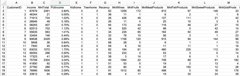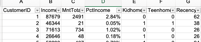 Data set includes a lot of information like customer demographics, their age, family size, amount spent, date joined, to name a few. It spans across 39 columns and 2206 rows. This data was key to understanding which customer groups were most active and how they responded to marketing efforts. Original data can be found here